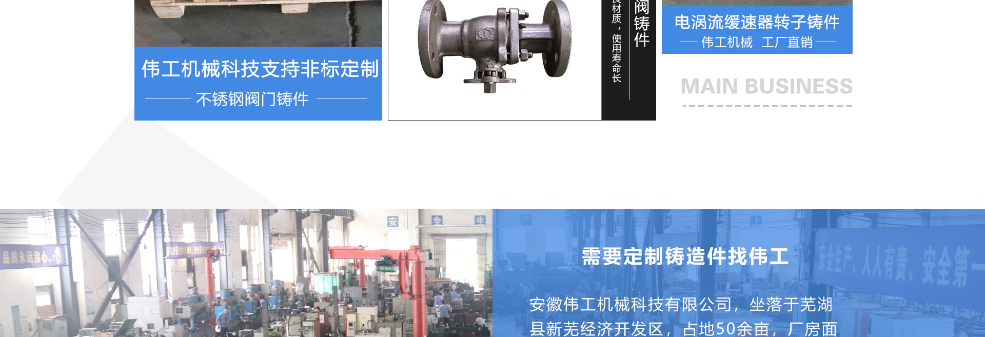 安徽偉工機(jī)械科技有限公司,坐落于安徽蕪湖新蕪經(jīng)濟(jì)開(kāi)發(fā)區(qū),是一家専業(yè)從事鑄造產(chǎn)品設(shè)計(jì)、研發(fā)、生產(chǎn)、銷售于一體的企業(yè),公司為客戶的產(chǎn)品提供多樣的技術(shù)支持與設(shè)計(jì),公司主要鑄造技術(shù)有潮模砂鑄造、硅溶膠精鑄工藝。主要產(chǎn)品有:不銹鋼閥門(mén)配件、泵閥配件、汽車配件、工業(yè)管道配件、工程機(jī)械配件、汽車配件等。材質(zhì)為:低合金鋼、304、316、316L、鉻鉬鋼、哈氏合金、碳鋼、雙相鋼等。公司已先后通過(guò)ISO9001和TS16949等多種體系審核,以完備的管理手段和齊全的檢測(cè)設(shè)備滿足客戶需求,進(jìn)的設(shè)備,専業(yè)的技術(shù),嚴(yán)謹(jǐn)?shù)墓芾?,穩(wěn)定的質(zhì)量。服務(wù)客戶,鑄造未來(lái),偉工誠(chéng)摯的歡迎新老客戶共同商洽合作